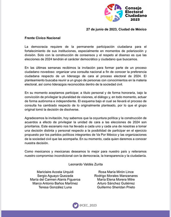 Sergio Aguayo y Guillermo Sheridan, analizarán de manera personal continuar apoyando a la alianza en lo individual o retirarse de la misma. Quienes integraban el consejo son: Leonardo Valdés Zurita, Mariclaire Acosta Urquidi, Sergio Aguayo Quezada, María del Carmen Alanís Figueroa, Marco Antonio Baños Martínez, Teresa González Luna, Rosa María Mirón Lince, Rodrigo Morales Manzanares, María Elena Morera Mitre. Arturo Sánchez Gutiérrez y Guillermo Sheridan Prieto.