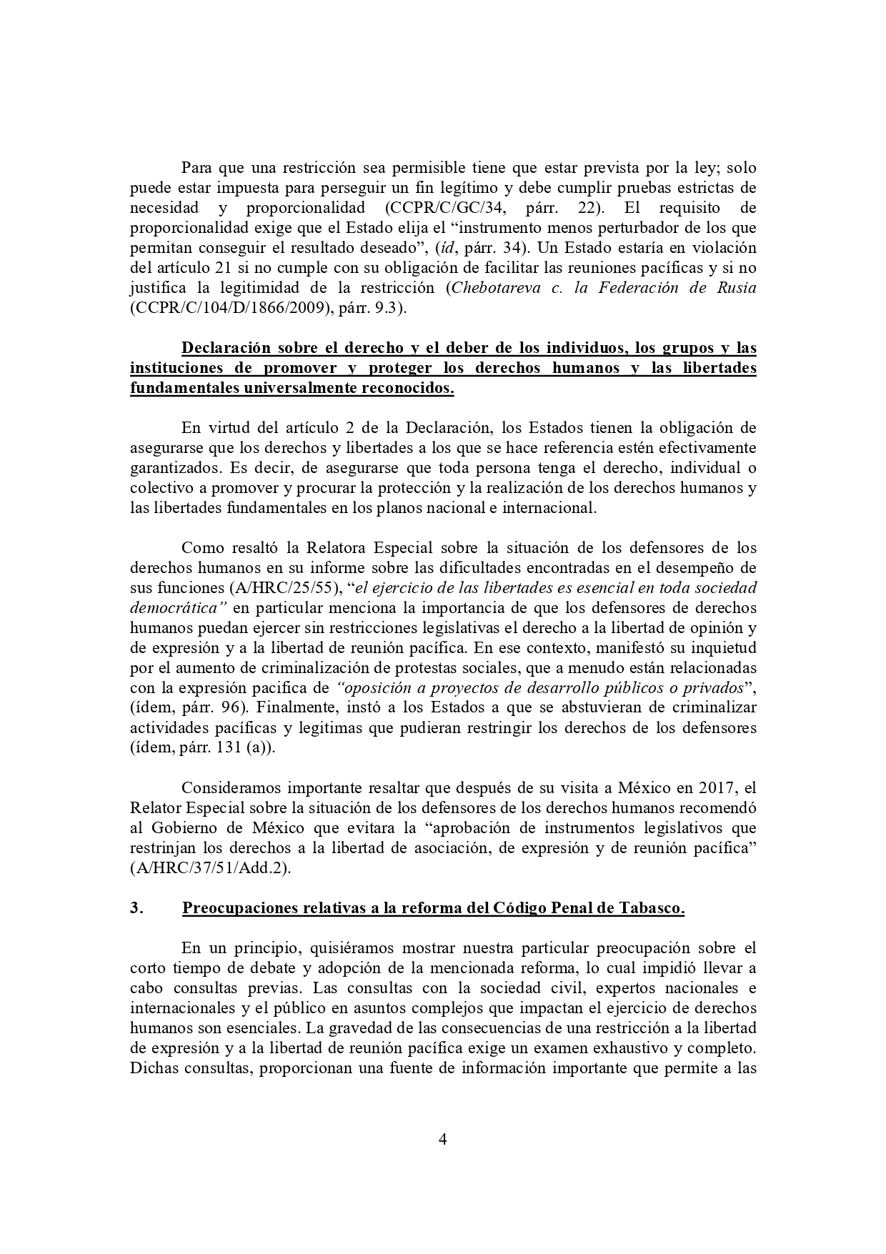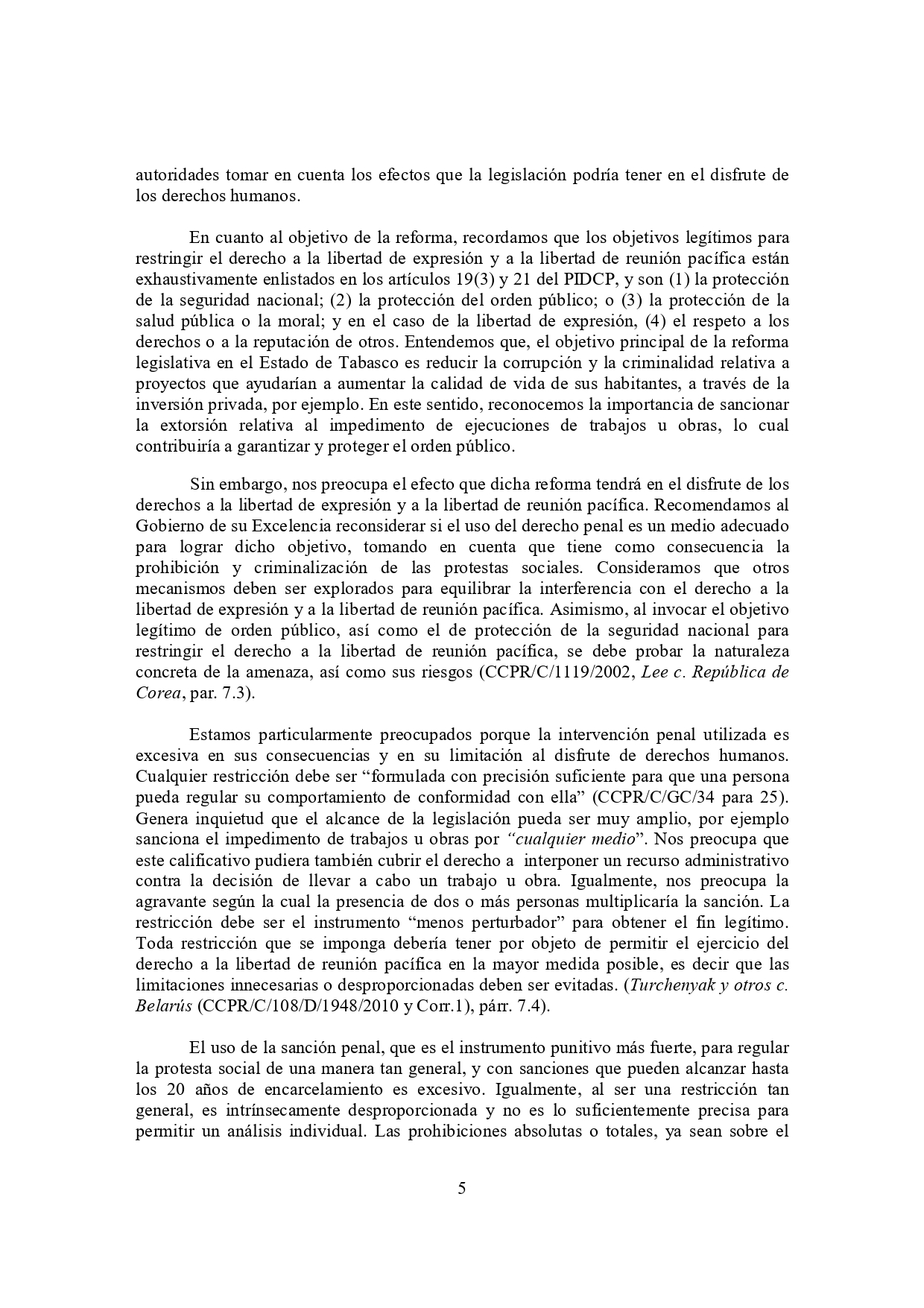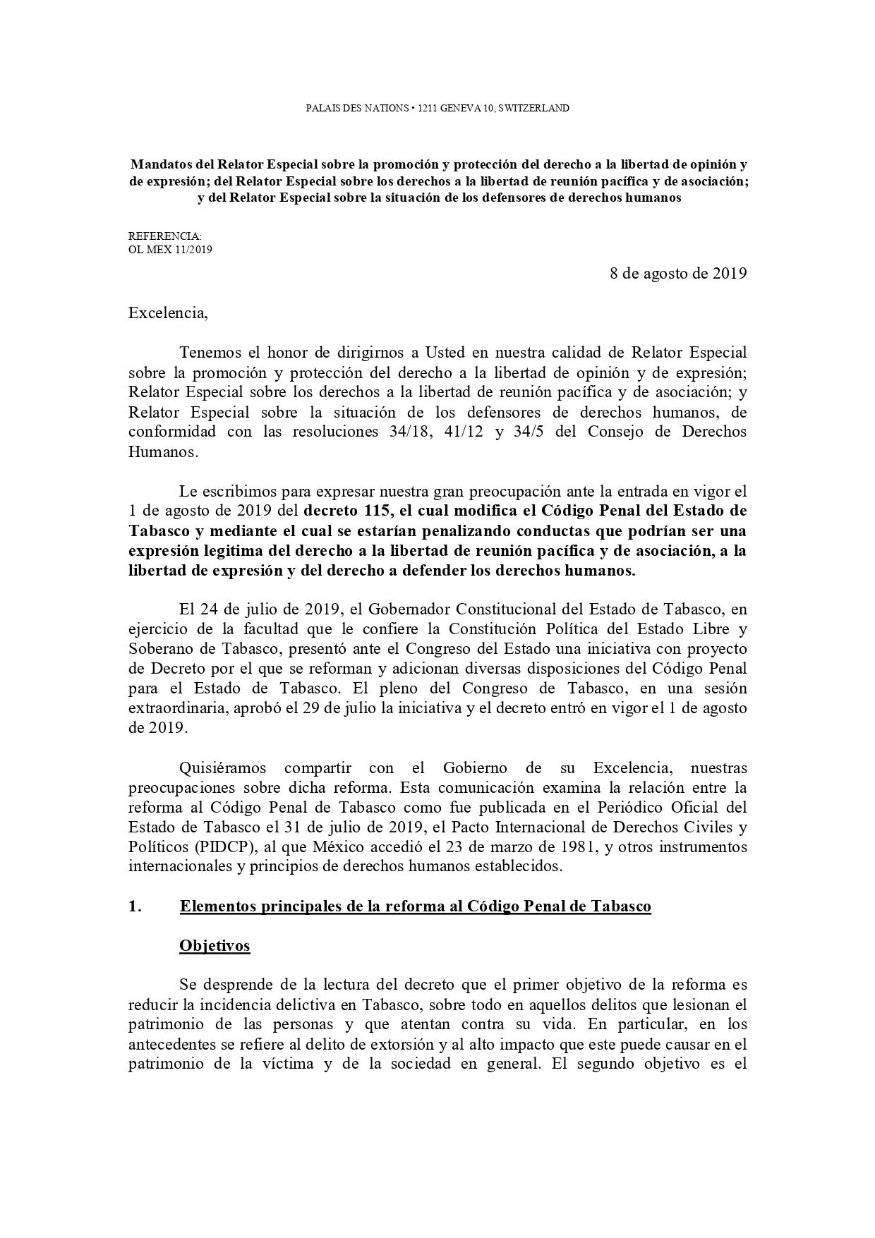 “Recomendamos al Gobierno de [Tabasco] reconsiderar si el uso del derecho penal es un medio adecuado para lograr dicho objetivo, tomando en cuenta que tiene como consecuencia la prohibición y criminalización de las protestas sociales”, se lee en la carta.