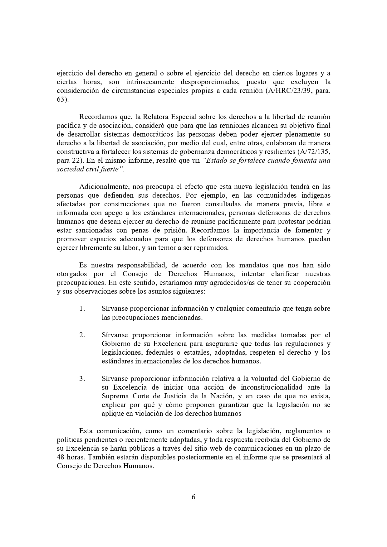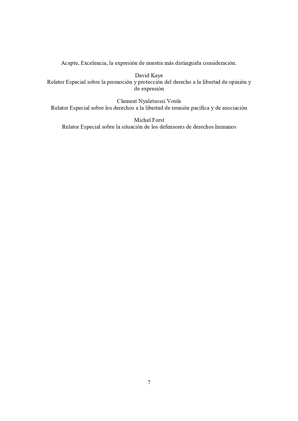 La carta fue firmada por David Kaye, relator especial sobre la promoción y protección del derecho a la libertad de opinión y de expresión; por Clement Nyaletsossi Voule, relator especial sobre los derechos a la libertad de reunión pacífica y de asociación; y por Michel Forst, relator especial sobre la situación de los defensores de derechos humanos.