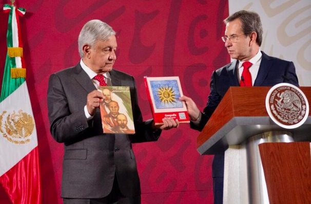 Moctezuma Barragán entregó al Presidente Andrés Manuel López Obrador un ejemplar de los primeros libros que en su portada muestran una ilustración con los retratos de Miguel Hidalgo, Benito Juárez y Francisco I. Madero, que representan las tres transformaciones históricas de México.