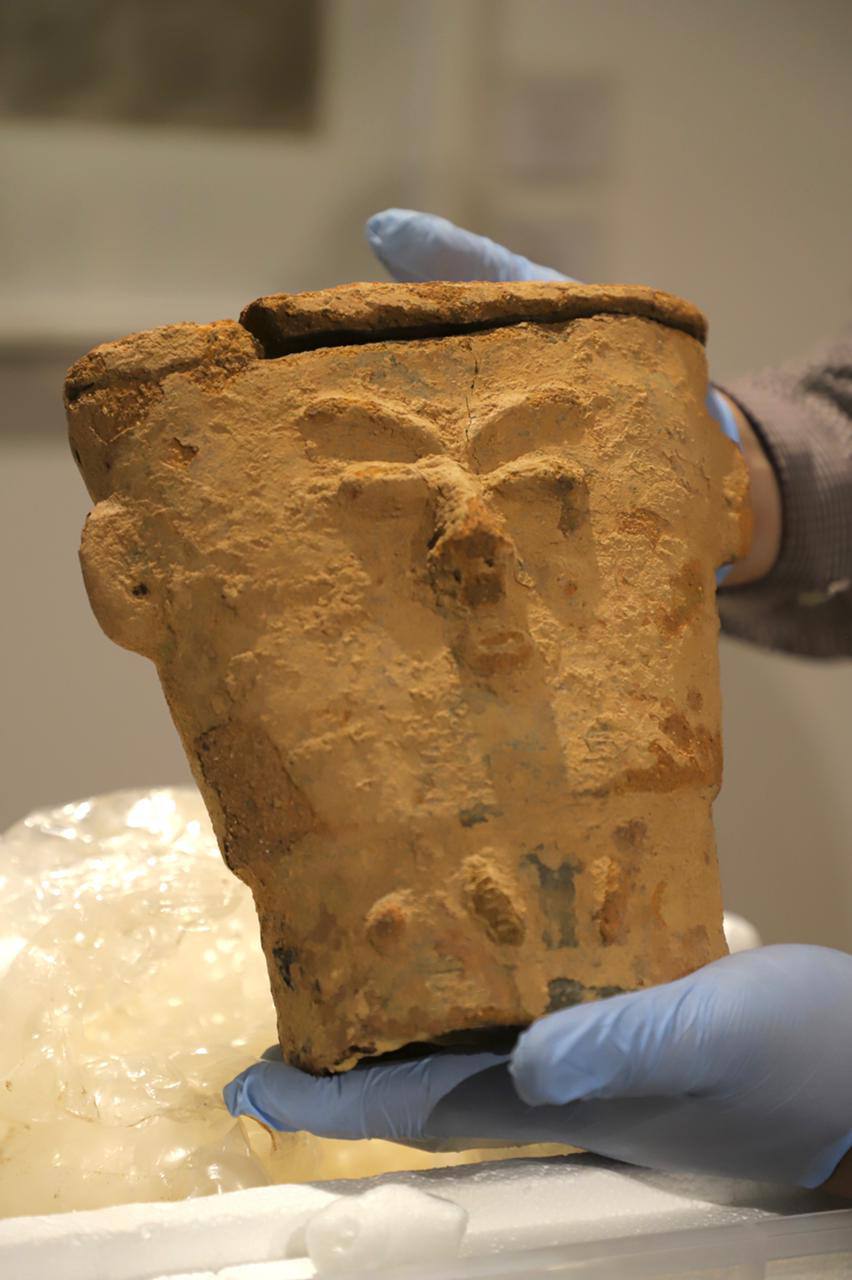Dos piezas arqueológicas: una urna de barro y una máscara de roca, además de un libro fechado en 1715, llegaron a la CDMX provenientes de Nueva York, tras ser entregadas voluntariamente por particulares al consulado de México.