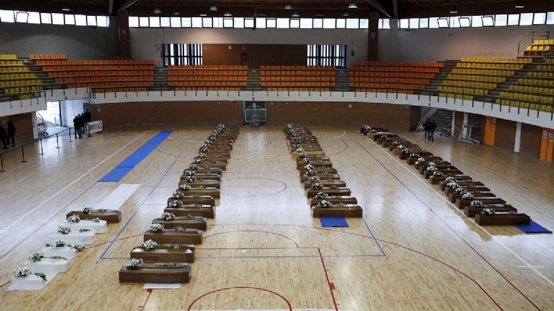 Los féretros —color marrón para los adultos y blancos para los niños— estaban dispuestos en hileras sobre el piso de madera del centro deportivo en la ciudad de Crotona. Sobre cada uno había un ramo de flores. Algunas personas colocaron juguetes sobre los ataúdes de los niños.