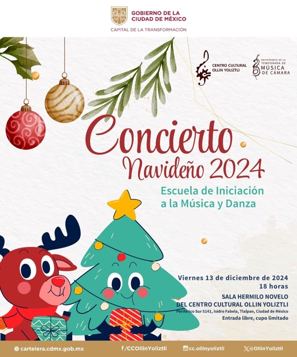 El concierto navideño de la Escuela de Iniciación a la Música y a la Danza se realizará el viernes 13 de diciembre, a las 18:00 horas en la Sala Hermilo Novelo del Centro Cultural Ollin Yoliztli y la entrada será libre.
