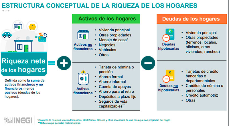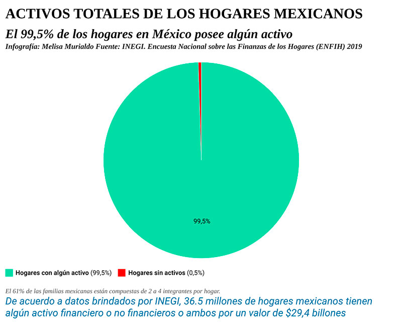 Teniendo en cuenta de que poseen bienes por un valor de 29,4 billones y deudas de 1,6 billones; el balance es positivo e indica un patrimonio de 27,8 billones, lo que equivale a 1,5 veces el PBI anual nacional. Lo preocupante es que a pesar de que, en el país, los hogares tienen más activos que deudas, solo a 13 cada 100 mexicanos les alcanza para ahorrar.