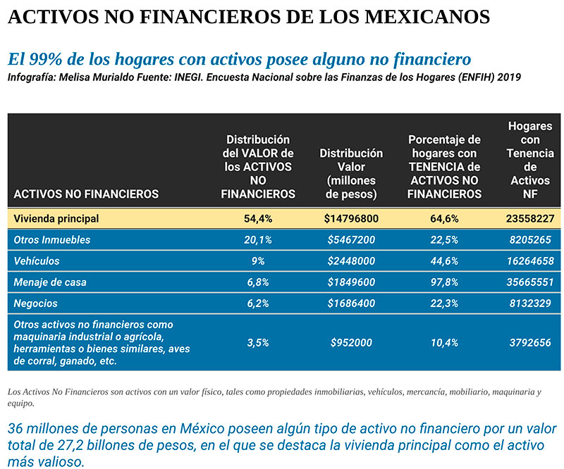 36 millones de personas en México poseen algún tipo de activo no financiero por un valor total de 27,2 billones de pesos, en el que se destaca la vivienda principal como el activo más valioso.