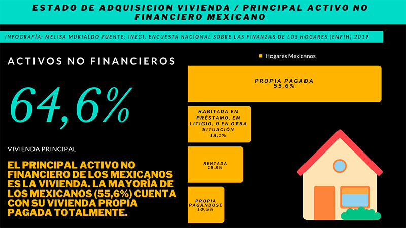 La mayoría de los mexicanos posee vivienda propia (64,6%). Por otro lado, de este 98.7% de los hogares que cuenta con activos se pudo detallar que 97,8% tienen menaje de casa, el 44.6% tiene algún vehículo, el 22.5% tiene un terreno diferente a donde reside, el 22.3% tiene algún otro negocio.