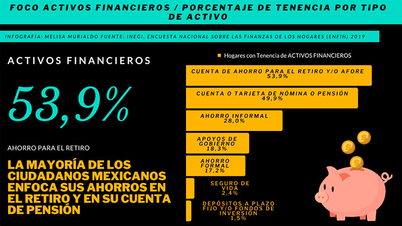 - 1%, otros tipos de activos financieros (pensión, apoyos del gobierno y seguro de vida)
