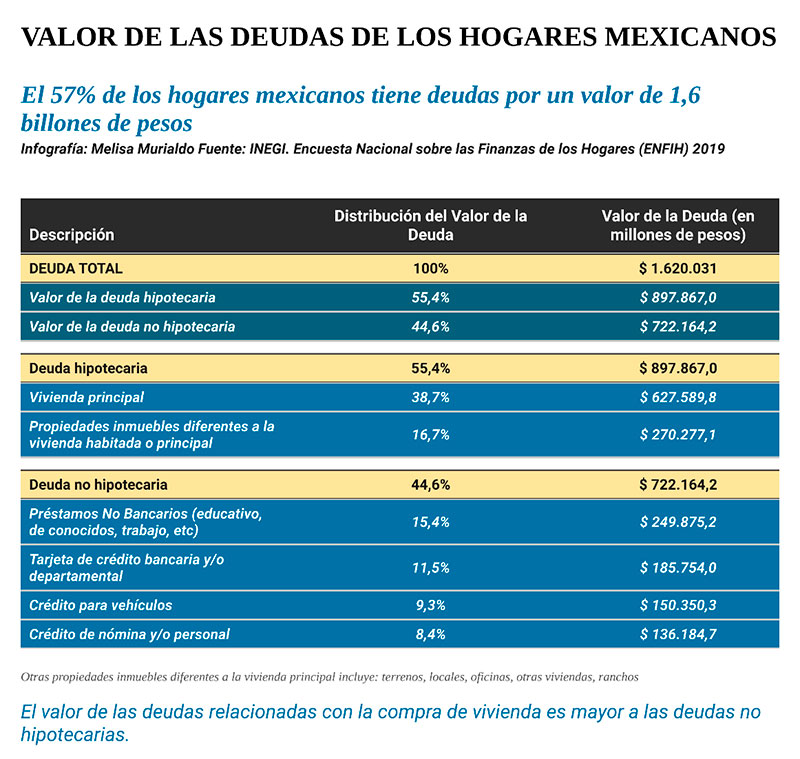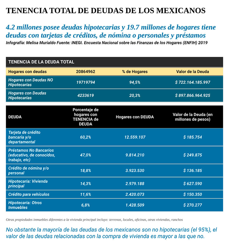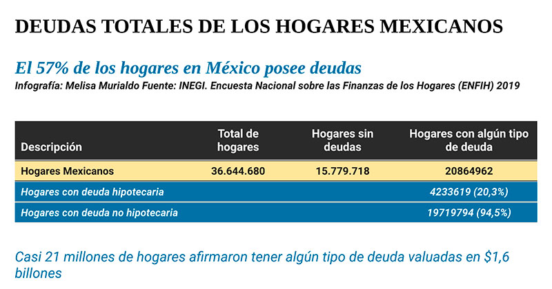 El 57% de los hogares en el país de México, casi 21 millones, afirmó tener algún tipo de deuda valuadas en $1,6 billones; 4.2 millones posee deudas hipotecarias y 19.7 millones de hogares tiene deudas con tarjetas de créditos, de nómina o personales, préstamos, etc.