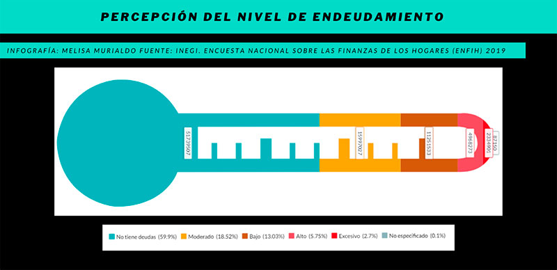 Aunque sólo un 8,5% de los mexicanos siente tener un nivel alto o excesivo de endeudamiento, el 66,5% de la población dice que solo les alcanza para lo necesario, un 12,8% que le queda algo de dinero para ahorrar y a un 20,7% directamente no le alcanza ni para lo básico.