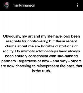 Fue Vanity Fair quién recogió, en respuesta al escrito de la intérprete, al menos cuatro mujeres han publicado en sus perfiles alegaciones de abusos por parte de Manson.