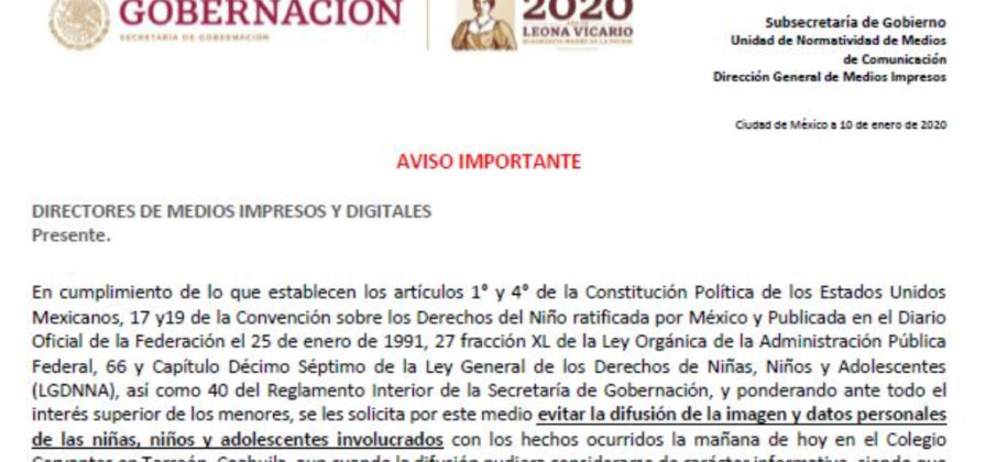 Gobernación pide a medios no difundir datos de menores involucrados en los hechos de Torreón
