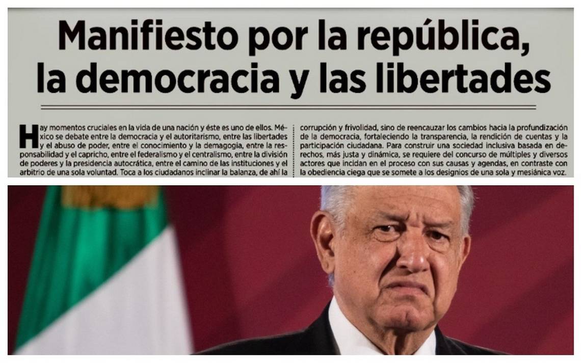 El manifiesto, publicado simultáneamente en los diario Reforma y El Universal incluye a un grupo de hombres de los mismos orígenes (298), se pronuncian la urgencia de replantear el rumbo del país, y sostienen que el presidente Andrés Manuel López Obrador viola la Constitución; pues interviene en las campañas al difundir propaganda, a través del escarnio y persecución de opositores.