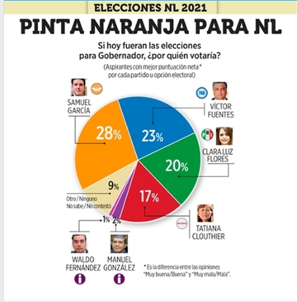 Según el estudio, practicado en base a encuesta telefónica y  con un márgen de error de más menos 2, en el lapso comprendido entre el 01 y el 08 de diciembre pasados, revela que es el senador neolonés por el Movimiento Ciudadano (MC),  Samuel García, encabeza la intención del voto con el 28%, seguido por Víctor Fuentes del PAN (23%), Clara Luz Flores del PRI (20%) y en un lejano cuarto lugar, por Tatiana Clouthier de Morena, con el 17%.