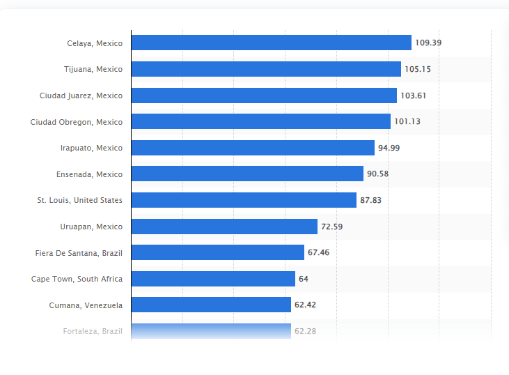 En el «Ranking de las ciudades más peligrosas del mundo en 2023, por tasa de homicidios por cada 100.000 habitantes», Celaya, en el Estado de Guanajuato, ocupa el deshonroso primer lugar con 109.39 homicidios por cada cien mil habitantes.