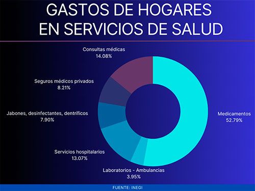 El último informe del Instituto Nacional de Estadística y Geografía (Inegi) señala que, en cuanto a los gastos específicos que realizan los hogares en servicios de salud, más de 50% se centra en medicamentos, mientras que un 14% se hace en consultas médicas y un 13% en servicios hospitalarios.