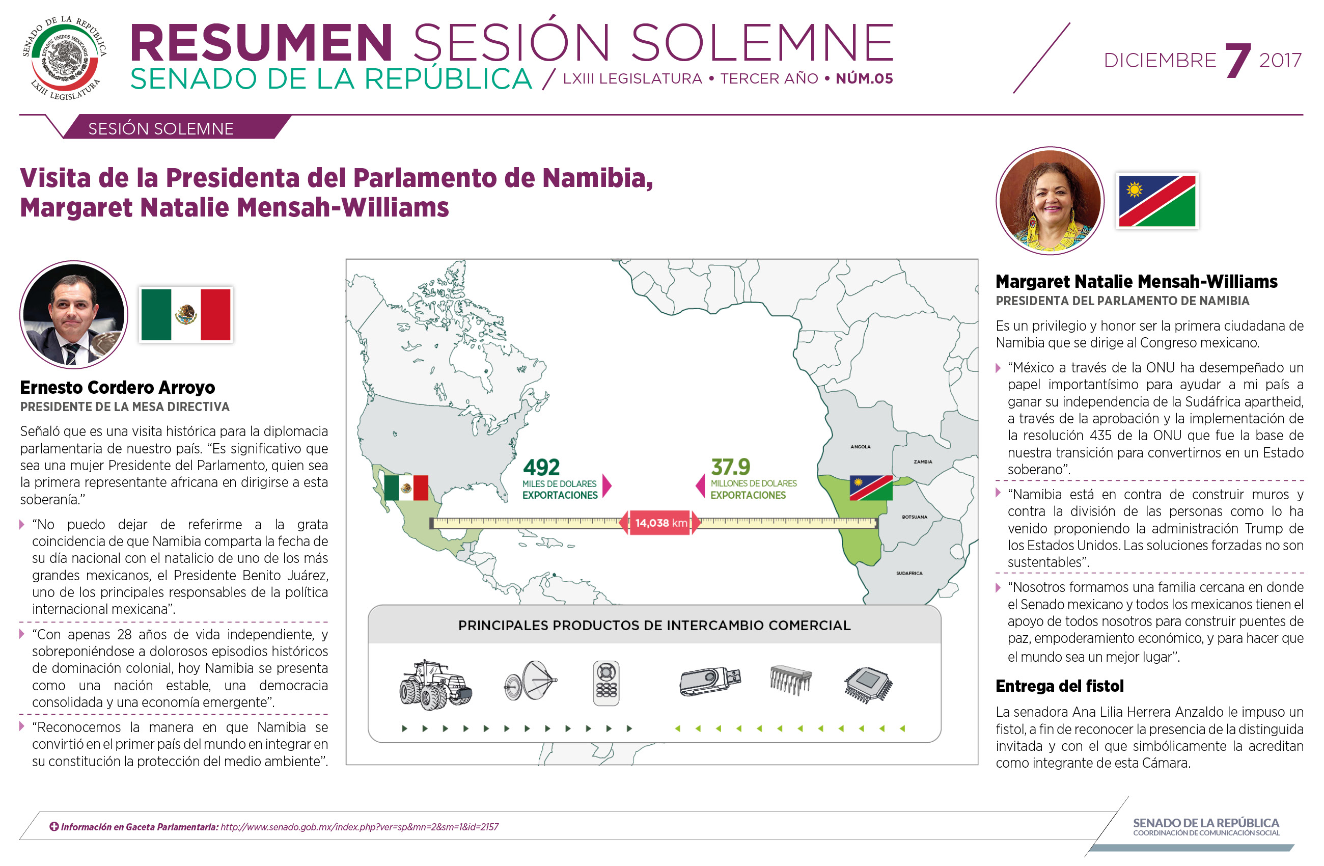 En sesión solemne para recibir la visita de la señora Margaret Natalie Mensah-Williamns, presidenta del Consejo Nacional de la República de Namibia, Cordero Arroyo destacó que la visita de esta mujer, es un acontecimiento histórico para la política internacional y la diplomacia parlamentaria de México, pues es la primera ocasión que se recibe en esta Cámara a un mandatario africano.