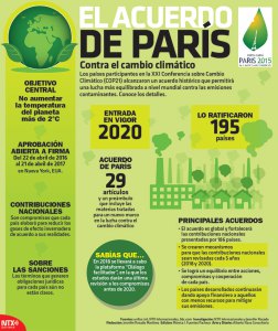 ONU México publicó a través de su cuneta en Twitter una infografía que detalla qué significa para México el Acuerdo de París. Menciona los elementos clave del convenio, cuyo objetivo principal es mantener el aumento de la temperatura del planeta debajo de los dos grados centígrados hacia finales de este siglo; a partir de 2020, cada cinco años los países revisarán y fortalecerán sus contribuciones nacional (INDC).