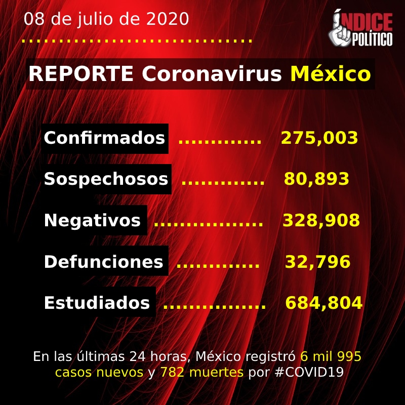 Ciudad de México. Índice Político.- La Secretaría de Salud dio a conocer que al corte del 08 de julio de 2020, suman 275 mil 003 casos confirmados acumulados de COVID-19 en México, mientras que hay 32 mil 796 muertos por la enfermedad.