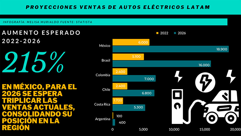 Para el portal estadístico internacional, el país alcanzará los 18 mil 900 automotores eléctricos en 2026, lo que generaría que las ventas en tres años se tripliquen, esto debido a que la demanda de autos eléctricos en México es la más alta de la región si se compara con otras naciones. Mientras, se prevé que Brasil llegue a los 16 mil vehículos y Colombia a los 7 mil.