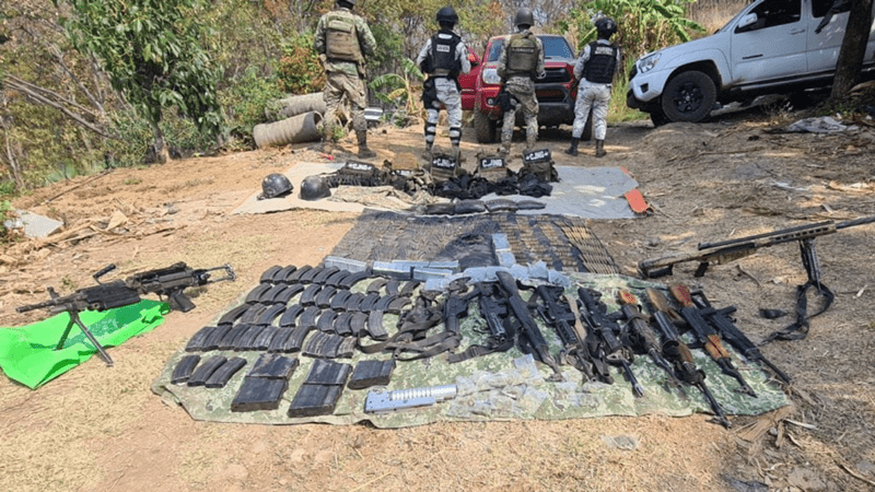 Debido a lo anterior, los uniformados procedieron a inspeccionar el asentamiento clandestino y localizaron armamento de grueso calibre y equipo táctico, entre los que se encontraron chalecos que tenían las siglas “CJNG”, según se aprecia en las imágenes compartidas por las autoridades.