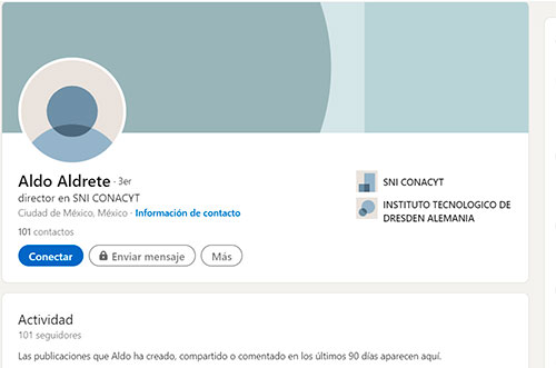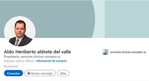 Este sujeto aparece en dos cuentas de LinkedIn, una red social para contactos profesionales, en los que se ostenta como propietario de una “sc” (sic) llamada concptos (sic). Si lo que quiso decir fue Sociedad Civil, las siglas deben ser escritas en mayúsculas, y, tal vez haya querido darse una licencia de marca, pero la palabra que él pone en la página con la que se presenta ante clientes y socios potenciales, no existe en el diccionario, la más parecida sería conceptos. Así que no es él quien puede dar clases de ortografía.