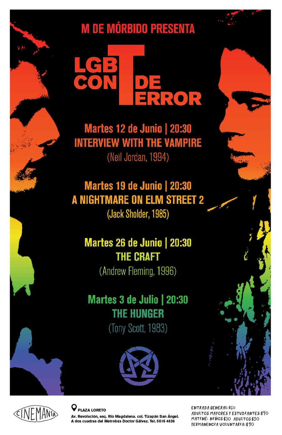 En este ciclo se presentarán cintas que tienen algún tipo de subtexto relacionado con el colectivo y que incluyen clásicos del género como Entrevista con el vampiro (1994), Pesadilla en la calle del infierno 2 (1984), Jóvenes brujas (1996) y The Hunger (1983).