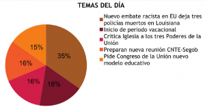 CIUDAD DE MÉXICO, 18 de julio (Almomento MX/Intelicast).- Entre las noticias principales que se publican en los medios de comunicación, de acuerdo con el monitoreo informativo realizado por Intelicast, se encuentra que tres agentes murieron en Baton Rouge, una de las ciudades convulsionadas por las protestas de afroamericanos debido a que dos agentes asesinaron a un ciudadano negro indefenso.