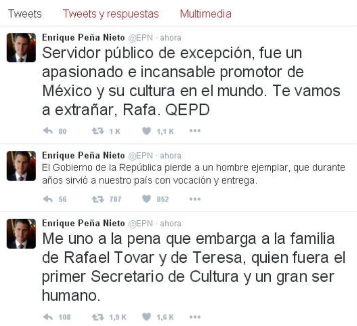 A través de su cuenta de “Twitter”, la dependencia público: “Con pesar informamos que el Srio. Rafael Tovar y de Teresa falleció esta madrugada, nuestro pésame a sus deudos y a la comunidad cultural”.