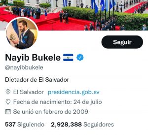 En su cuenta oficial, ahora tiene como bío “Dictador de El Salvador”. A comienzos de año, su presentación era “Papá de Layla”, su hija que nació en 2019.