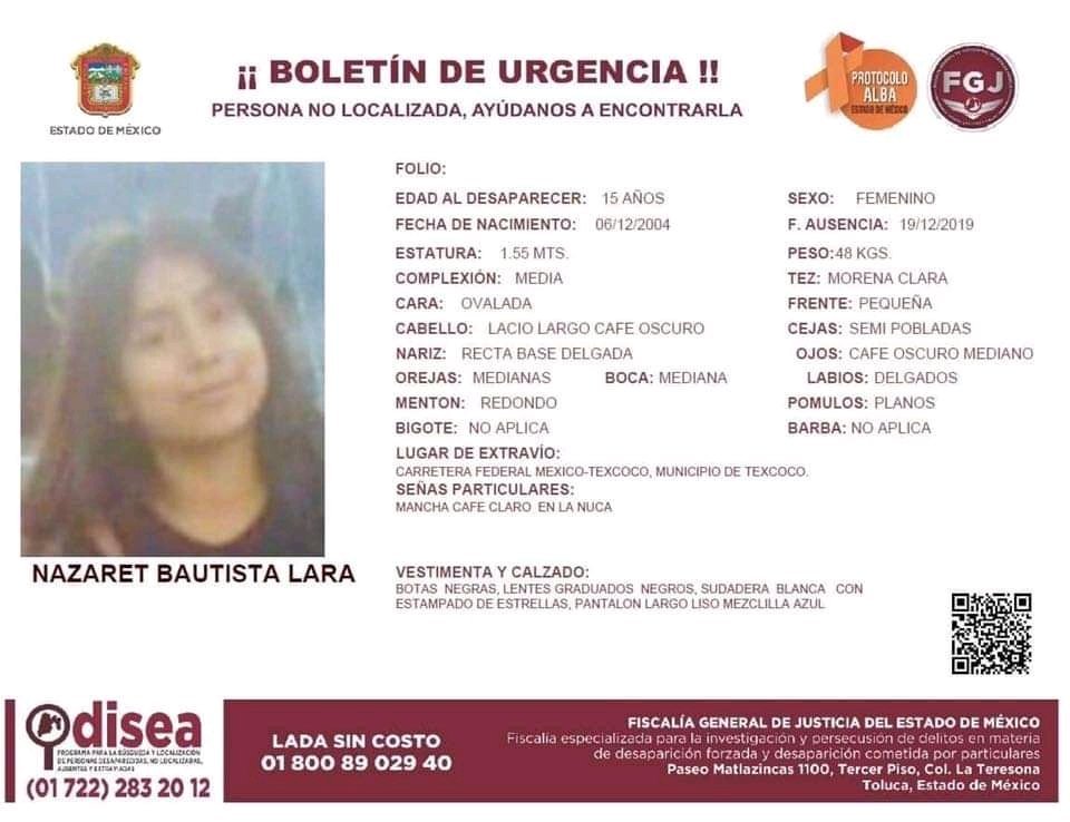 Sin embargo, este lunes 23 de diciembre, el personal de la Fiscalía Especializada en Personas Desaparecidas empezó su intervención y aproximadamente a las 17:00 horas encontró el cuerpo sin vida de una persona del sexo femenino que tenia las características de la menor y que luego fue identificada por la familia. El cuerpo Nazareth ya fue trasladado a la sierra de Hidalgo de donde es originaria.