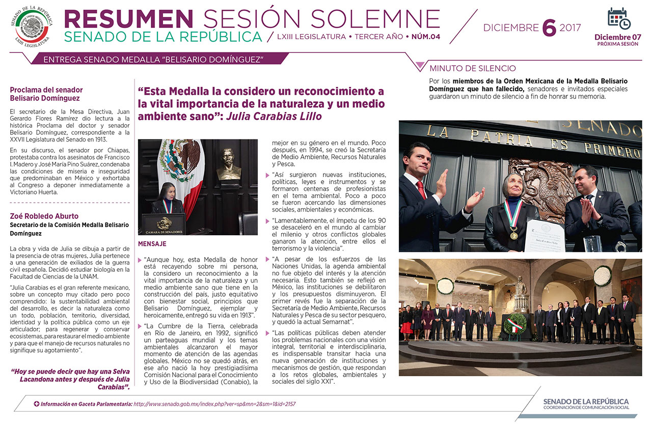 El Senado de la República confirió la Medalla de Honor Belisario Domínguez 2017 a Julia Carabias Lillo, como un justo reconocimiento pors su valiosa contribución al cuidado del medio ambiente, sus aportaciones científicas relacionadas con los recursos naturales, la restauración ambiental y la conservación de ecosistemas.
