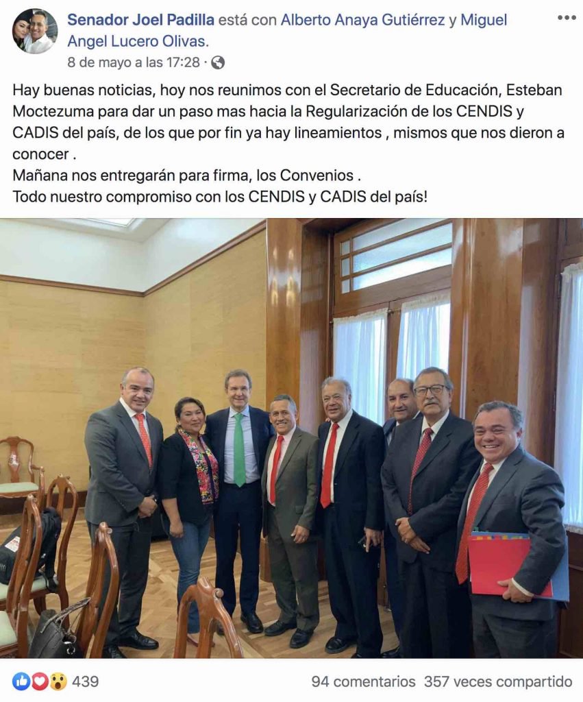Incluso, en una foto tomada en esa reunión, que subió a su página de Facebook el senador Padilla, se puede ver quienes asistieron: el secretario Moctezuma, el coordinador nacional del PT, Alberto Anaya; el senador Miguel Ángel Lucero y el coordinador de calidad educativa de los Cendis de Nuevo León, Bernardo Aguilar Montiel, entre otros.