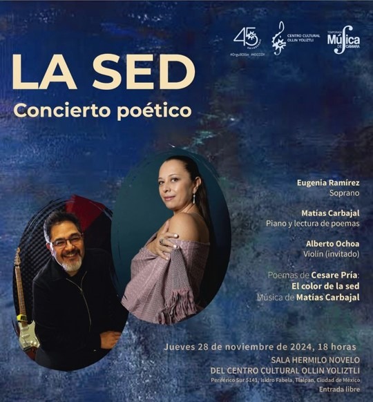 La Temporada de Música de Cámara de Centro Cultural Ollin Yoliztli presentará el jueves 28 de noviembre, a las 18 horas, una amalgama entre los poemas de Cesare Pría y la música de Matías Carbajal.