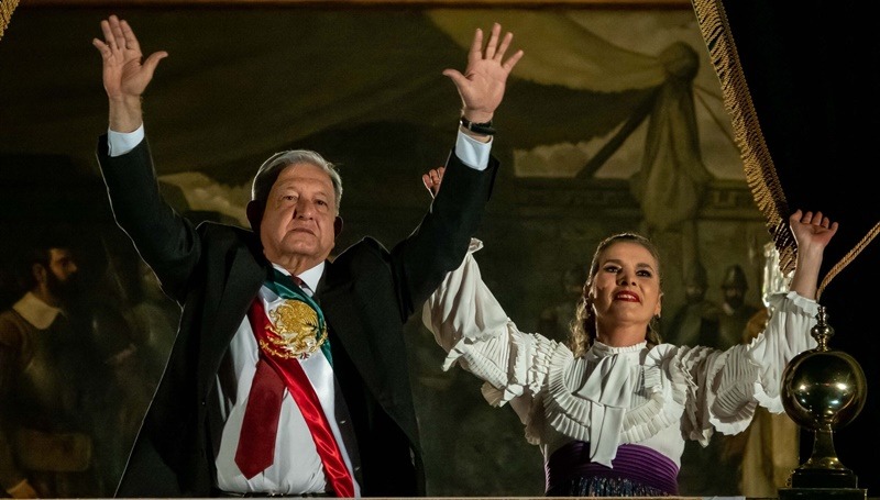 Entonces el mandatario se desabrochó el botón de su traje y dejó ver la banda presidencial que porta desde el 1 de diciembre de 2018, saludó a los asistentes y tomó la mano de su esposa, la doctora Beatriz Gutiérrez.