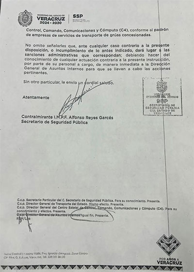 La instrucción es clara y precisa, todo el personal operativo, de la Policía Vial o Agentes de Tránsito deberán conducirse con total apego a los Principios Constitucionales de disciplina, legalidad, objetividad, profesionalismo, honradez, lealtad, imparcialidad, integridad, rendición de cuentas, eficacia, eficiencia y respeto a los derechos humanos, señala el oficio SSP/SP/ DIC/ 011/2024 signado por el Contraalmirante Alfonso Reyes Garcés, secretario de Seguridad Pública.