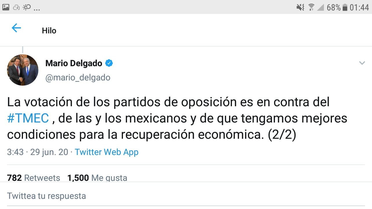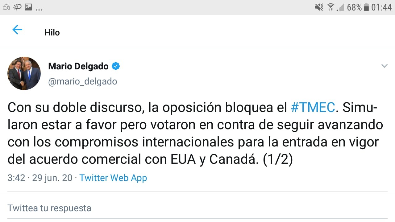 Mario Delgado, presidente de la Jucopo de la Cámara de Diputados, afirmó que en la oposición hay un “doble discurso” al bloquear el T-MEC, simular estar a favor, pero votar en contra “de seguir avanzando con los compromisos internacionales para la entrada en vigor del acuerdo comercial con Estados Unidos y Canadá”.