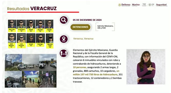 La información confirmada señala que fue gracias a una operación conjunta realizada por el Ejército Mexicano, la Guardia Nacional (GN) y la Fiscalía General de la República (FGR), en los municipios de Veracruz y de Ignacio de la Llave, que las autoridades catearon seis inmuebles vinculados a esta actividad ilícita y lograron la detención de 10 personas presuntamente relacionadas con la red delictiva, de acuerdo con información del Gabinete de Seguridad.