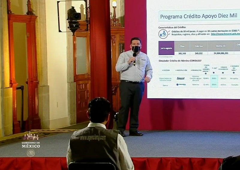 Durante su presentación de avances y resultados en la conferencia vespertina Crédito a la Palabra, Ortiz Bolaños recordó que este crédito se paga en 33 cuotas mensuales de 360 pesos, además de contar con un periodo de gracia de tres meses y una tasa de interés anual de 10.88 por ciento, la más baja de acuerdo con el simulador de crédito de nómina de la Comisión Nacional para la Protección y Defensa de los Usuarios de Servicios Financieros (Condusef).