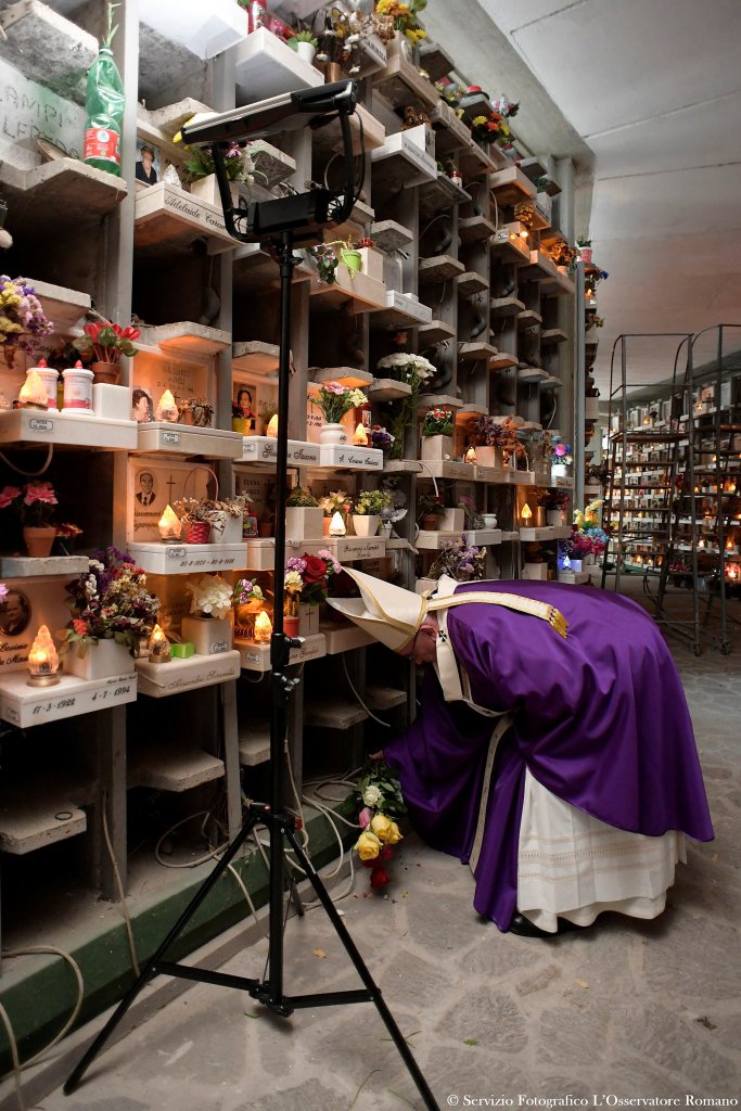 Es la primera vez que el Papa celebra la fiesta de los fieles difuntos en el cementerio de Prima Porta, ya que los primeros tres años de su pontificado al cementerio monumental del Verano, el más grande de la ciudad.