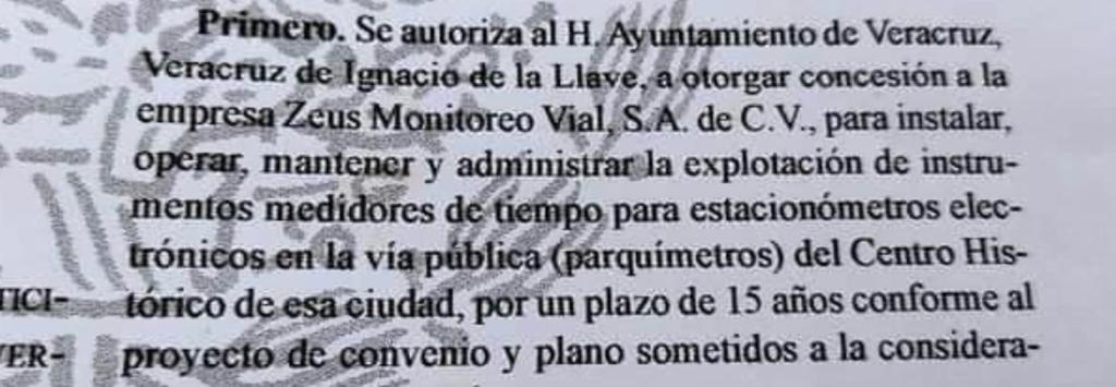 Gómez Cazarín recordó que fue en el año 2007 cuando la LX Legislatura, autorizó al ayuntamiento de Veracruz, gobernado en ese entonces por el hoy senador Julen Rementería del Puerto (quien ya iba de salida), el otorgar la concesión a la empresa Zeus Monitoreo Vial SA de CV para instalar, operar, mantener y administrar la explotación de instrumentos medidores de tiempo para estacionamientos electrónicos en la vía pública (parquímetros), de acuerdo a Gaceta Legislativa 28 miércoles 13 de junio de 2007.