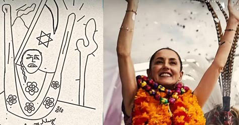 En 1960 Parravicini dibujó en una hoja en blanco a una mujer delgada con los rasgos de Sheinbaum con los brazos levantados, flores en su atavío y flanqueada por un volcán, una hoz y una estrella de David (en alusión a su origen judío).
