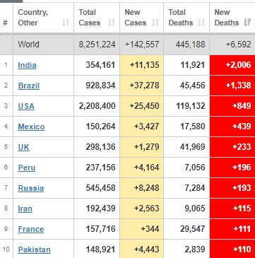 Las cifras son del medidor mundial de Covid 19, cuyo nombre original en inglés es “Worldometer COVID-19 Data”, las cuáles generalmente se adelantan unas 20 horas a las que proporciona el doctor Hugo López Gatell, en su conferencia diaria de las siete de la noche, tiempo central de México.