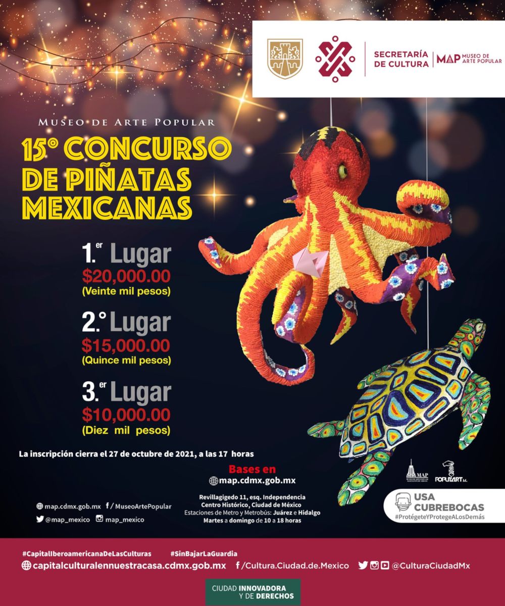 CIUDAD DE MÉXICO.- La Secretaría de Cultura de la CDMX, a través del Fideicomiso Museo de Arte Popular (MAP), convoca a los artesanos mexicanos o extranjeros residentes en México a poner manos a la obra y participar en la décimo quinta edición del Concurso de piñatas mexicanas.