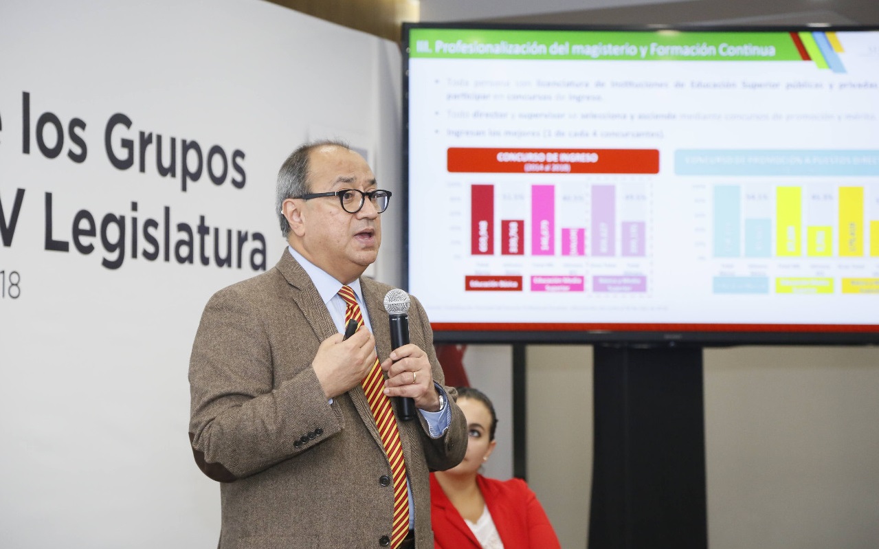 Al participar en una reunión informativa, previa a la instalación de la LXIV Legislatura, dijo que, al inicio de la transformación educativa, en el promedio de los cinco estados con más alto desempeño, incluida la Ciudad de México, apenas el 52 por ciento de los participantes en los concursos de oposición lograron el resultado denominado Idóneo, y hoy lo alcanza el 70 por ciento.