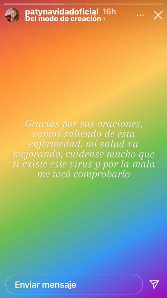 A través de su supuesta cuenta de Instagram (@patynavidadoficial), Paty Navidad agradeció a sus seguidores las oraciones que hicieron por su salud, la cual va mejorando; además, aceptó la existencia del Covid-19, aunque lo tuvo que “comprobar a la mala”.