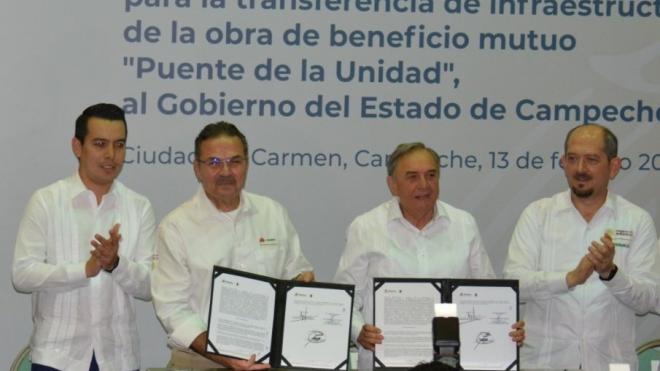 Redacción MX Político.- Petróleos Mexicanos (Pemex) condonó al gobierno de Campeche el adeudo de 332.4 millones de pesos por el nuevo Puente de la Unidad, obra de beneficio mutuo que comenzó a construir el gobierno de Felipe Calderón con recursos de la petrolera y se inauguró, a medio terminar, apenas el año pasado.