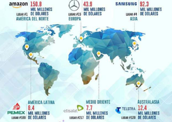 En su más reciente reporte correspondiente al 2018, la firma con sede en Londres dio a conocer las principales marcas del mundo por cada región –según su metodología- ubicando a Petróleos Mexicanos como la empresa líder en Latinoamérica y la número 190 a nivel global.