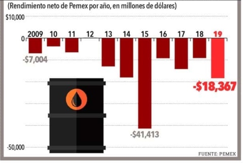 Índice Flamígero: Petróleos Mexicanos registró pérdidas por 346 mil 135 millones de pesos durante 2019, un aumento de 92 por ciento respecto a las pérdidas de un año antes, según la información reportada a la Bolsa Mexicana de Valores (BMV) el jueves anterior. En 2018, la petrolera nacional que dirige Octavio Romero Oropeza tuvo pérdidas por 180 mil 419 millones de pesos. Es decir, en 2019 la petrolera superó esta cifra negativa en 165 mil 716 millones de pesos. “Cerramos uno de los años más complejos de la historia reciente de Petróleos Mexicanos. La situación operativa y financiera estaba determinada por aspectos negativos (…). Los resultados que aquí se presentan al cuarto trimestre de 2019, están determinados aún por la inercia y los rezagos de los últimos años”, se lee en el documento enviado a la Bolsa. En conferencia telefónica con analistas, el director corporativo de finanzas de Pemex, Alberto Velázquez García, aseguró que dos factores que incentivaron las pérdidas fueron una baja en las ventas internas y menor volumen en el crudo vendido al extranjero. En su reporte financiero a la Bolsa, la petrolera enumera algunos aspectos que condicionaron su operación el año pasado: su nivel de endeudamiento, el robo de combustible y el régimen fiscal al que estaba condicionado la empresa.