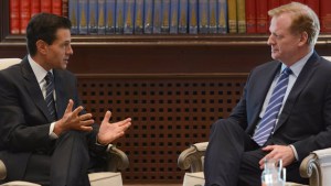 CIUDAD DE MÉXICO, 21 de noviembre (AlmomentoMX).- El presidente Enrique Peña Nieto recibió al comisionado de la NFL, Roger Goodell, con quien platicó sobre los preparativos para el encuentro entre Texanos de Houston y Raiders de Oakland con el que se cierra la actividad de la semana 11 en la National Football League.