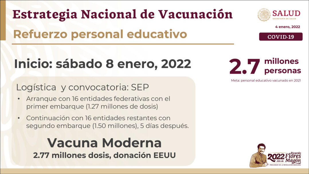“El 8 de enero arrancará la aplicación de dosis de refuerzo en personal educativo, con 2.7 millones de la vacuna Moderna, son 2.77 millones que forman parte de una donación de Estados Unidos, con el primer embarque de 1.7 millones arrancará la vacunación en 16 entidades y con el segundo embarque, de 1.5 millones que llegará 5 días después, se vacunará en las otras 16 entidades”, apuntó.